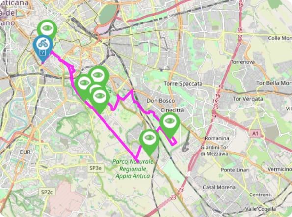 Il percorso attraversa il Parco dell’Appia Antica, la Valle della Caffarella e il Parco degli Acquedotti, dove antichi archi romani diventano lo scenario ideale per una degustazione di vini e prodotti tipici.